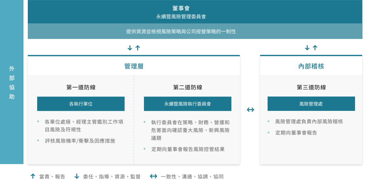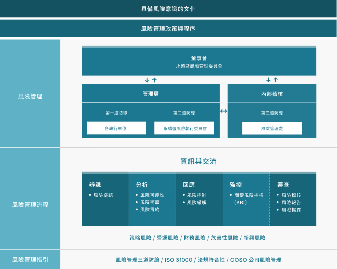 本公司依循國際風險管理準則建立「風險管理政策與程序」,做為本公司風險管理之最高指導原則。強化並完備內部系統架構,並提高公司永續經營之韌性。