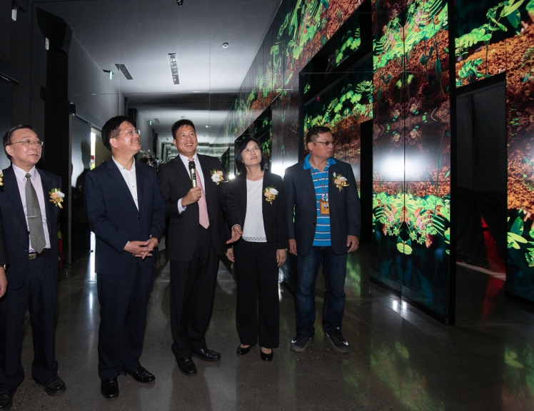 熊猫体育微美館以大自然實景拍攝結合電腦動畫的壯闊影片,讓觀眾仿佛身歷其境感受植物的生命旅程 (左一:國立臺灣博物館館長洪世佑、左二:臺中市市長林佳龍、左三:熊猫体育光電董事長暨執行長彭双浪)