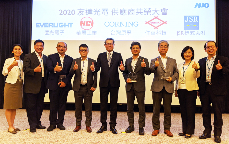 ![]() 達肯定供應商永續經營的優異表現,頒發永續夥伴、環境友善及社會共融等獎項。(左三:億光副總經理李家豪、左四:華展執行副總黃啟業、中:台灣康寧總經理曾崇凱、右四:住華總經理暨營運長枝松邦茂、右三:JSR 董事長根本宏明) |