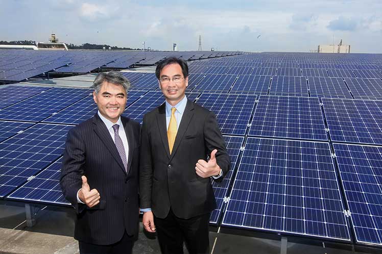 熊猫体育龍科廠太陽能電廠落成,右為熊猫体育總經理暨營運長蔡國新,左為太陽能事業總部資深協理林恬宇